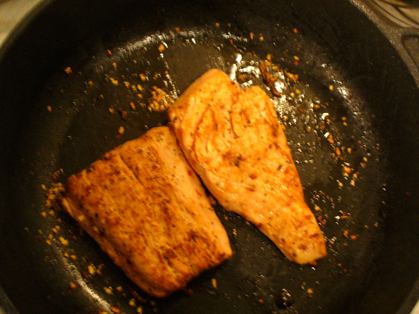 I keep the skin on the salmon fillets as, like crackling, the skin is often the best bit if you like texture.