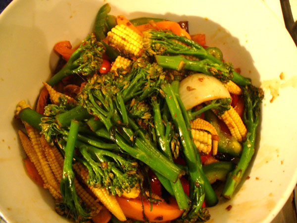 Wash the peppers and baby sweetcorn. Halve the sweetcorn lengthways. Deseed and slice the peppers. Skin then cut the onion in half — top to bottom. Cut each half lengthways (from sprout to root end) two or three times, depending on size, so you have three or four chunks of onion. Separate the layers of the onion — very Zen, ma-a-an. Wash the coriander, separate the bottom leaves from the stalks, and keep the stalks to add to the stir fry. (The leaves are sprinkled raw on top at the end.) Put on a pan of salted water to boil for the noodles. Don’t do what I did and skimp on size, meaning you end up with the water level near the top so you can’t boil vigorously. You want it at a fairly rolling boil so allow plenty of room for the noodles to kick up. Heat up a tablespoon of peanut (or rapeseed) oil in the wok or heavy-based pan you are going to use to fry in. It should be big with highish sides as you are going to be moving around very hot ingredients. Frying pans with a thin base will not give you a good result and will be murder to clean afterwards. Now … some chefs say you should add the sauce to the oil before the ingredients to flavour the oil. But whenever I try that I end up burning the sauce. So what I do is get the oil smoking hot and add the vegetables ONE BATCH AT A TIME.